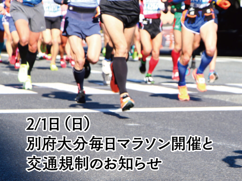 2026年1月10日 / 最終更新日 : 2026年1月10日 utsuwa_02 イベント 別府大分毎日マラソン開催と交通規制のお知らせ いつも日本旅館器のブログをご覧いただき、誠にありがとうございます。さて、2月1日(日)に毎年多くのランナーと応援の方で賑わう「別府大分毎日マラソン」が、別府市・大分市内にて開催されます。世界トップレベルの選手たちの力走を間近でご覧いただける貴重な大会ですので、お時間の許す方は、ぜひ沿道での観戦もお楽しみください。街全体が熱気に包まれる、特別な一日となります。大会当日は、コース周辺の道路において交通規制や通行止め、渋滞が予想されております。そのため、当宿へお越しのお客様、またチェックイン・チェックアウトをご予定のお客様におかれましては、お時間に余裕をもってご移動いただきますようお願い申し上げます。交通規制の詳細や最新情報につきましては、大会公式ホームページや警察・自治体からの案内をご確認ください。ご不便をおかけする点もございますが、別府・大分が一体となって盛り上がる大きなイベントでもございます。どうぞご理解とご協力のほど、よろしくお願い申し上げます。皆さまのお越しを、スタッフ一同心よりお待ちしております。大会公式ホームページhttps://www.betsudai.com/交通規制のお知らせ(pdf)https://www.betsudai.com/wp-content/themes/betsudai/pdf/74/kou.pdf 安心してお過ごしいただけるよう徹底したウイルス感染予防対策を行い↓ お客さまをお迎えしております。↓ お気軽にお問い合わせください。0977-85-7782お電話でのお問い合わせ時間 8:30〜20:00 お問い合わせ
